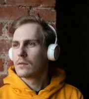 A spacious room with wooden flooring is filled with natural light streaming through large windows. A potted plant with wide, green leaves sits prominently on the floor. The walls are decorated with large speakers and a neon sign that reads 'We work for musicians'. A shiny disco ball and spotlights are visible on the ceiling, contributing to a modern and artistic vibe.